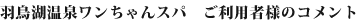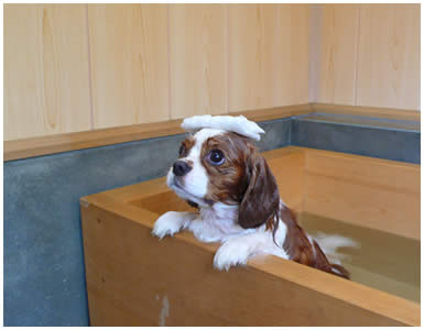 | 愛犬専用の源泉かけ流し温泉施設です。効能豊かな羽鳥湖温泉はワンちゃんの毛艶を良くし、肉球がしっとりし、肌にも良いと評判です。乾燥コーナーもあります。 【別料金】 貸し切り個室(貸しタオル付き) :45分1,500円 (税別) (宿泊のお客様は1,000円 (税別)) ブースタイプ(小・中型犬まで) :20分500円 (税込) |