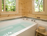 ログハウスはフィンランド産ログ材から生まれたビックフット社製の本格派。各戸に「美肌の湯」と名高い羽鳥湖温泉(アルカリ性単純泉・pH値9.8)を源泉かけ流しで引き込んでいます。自分だけの贅沢な温泉を心ゆくまでご堪能ください。バスルームの大きな窓を解放すると、森をながめながら露天感覚でお楽しみいただけます。