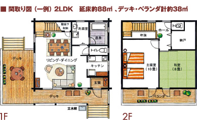 2階建ての2LDK、約88m2。ゲストを招いてもゆったり寛げるゆとりのスペースです。備え付けのデッキテラスでは、バーベキューもお楽しみいただけます。室内にはモダンな家具が配され、長期滞在のためのキッチンや電化製品などの生活用品も完備。リゾートの開放感と我が家の快適性が両立した心地よい空間です。 ※定員6名仕様(最大8名宿泊可能)