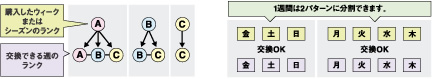 ご購入の週と同ランク以下の週で、他施設や他の時期へ交換ができます。交換単位は1週間・前半の3泊4日・後半の4泊5日の3パターンです。 ※交換手数料:1回交換成立ごとに5,250円